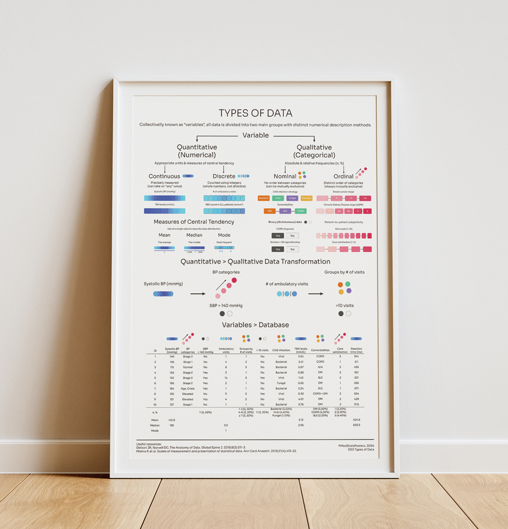 I am very proud of how this poster turned out. The four types of data are clearly described using concise examples. "Types of Data" introduces color patterns that you will now start seeing in subsequent posters.